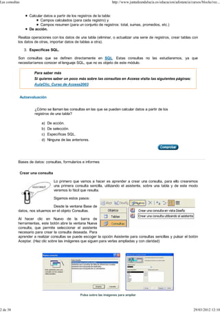El documento explica qué son las consultas en bases de datos. Las consultas permiten extraer información específica de una o más tablas mediante filtros y condiciones. Se pueden crear consultas de selección para obtener y mostrar datos, consultas de acción para modificar datos, y consultas SQL para consultas avanzadas. El documento describe cómo crear consultas sencillas usando el asistente o la vista de diseño.