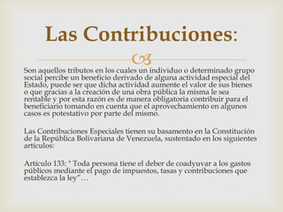 Este documento resume diferentes tipos de contribuciones especiales según la legislación venezolana, incluyendo contribuciones de mejoras, parafiscales, del Seguro Social Obligatorio, previstas en la Ley de Ciencias y Tecnología e Innovación, y en la Ley contra el Tráfico Ilícito de Drogas. También distingue entre obligaciones legales no tributarias y tributos atípicos.
