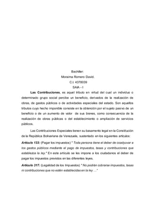 Este documento describe diferentes tipos de contribuciones especiales según la legislación venezolana, incluyendo contribuciones por plusvalía causada por cambios de uso e intensidad de aprovechamiento de propiedades y contribuciones por mejoras derivadas de obras públicas. Explica los conceptos, bases legales, procedimientos de cálculo, porcentajes de aumento de valor permitidos, y formas de pago de cada tipo de contribución.