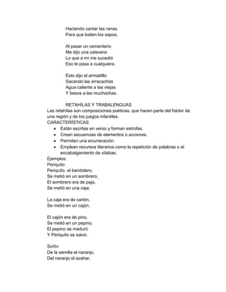 Este documento describe diferentes formas de expresión poética tradicional de carácter popular como las coplas, retahílas y trabalenguas. Explica que las coplas son composiciones humorísticas que expresan sentimientos, costumbres y valores de un pueblo. Las retahílas y trabalenguas son juegos de palabras que usan recursos como la repetición y el encabalgamiento de sílabas. Además, incluye numerosos ejemplos de estas formas poéticas.