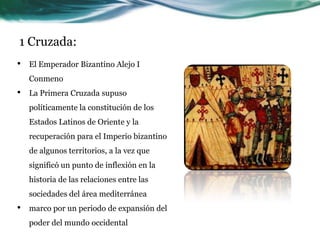 La Primera Cruzada resultó en el establecimiento de los Estados Latinos de Oriente y la recuperación de territorio para el Imperio Bizantino. La Segunda Cruzada tuvo éxito en la península ibérica pero fracasó en oriente, llevando a la caída de Jerusalén en 1187. La Tercera Cruzada, convocada por el Papa, intentó recuperar Tierra Santa bajo el liderazgo de Ricardo Corazón de León pero solo logró asegurar una franja costera para los cristianos.