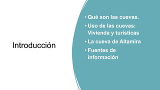 Este documento habla sobre las cuevas. Explica que las cuevas son cavidades naturales formadas por la erosión del agua, hielo u otros factores. También describe que las cuevas se usaban como vivienda en la prehistoria y actualmente son usadas con fines turísticos y de investigación geológica. Se menciona específicamente la cueva de Altamira como un importante sitio prehistórico declarado patrimonio de la humanidad.