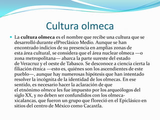 La cultura olmeca fue la primera civilización mesoamericana que se desarrolló entre 1500 a.C. y 400 a.C. en el sur de México. Los olmecas tenían un gobierno teocrático gobernado por reyes-sacerdotes y una sociedad estratificada dominada por una élite sacerdotal-guerrera. Basaban su economía en la agricultura alrededor de los ríos y es posible que hayan desarrollado la primera escritura del continente americano.