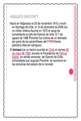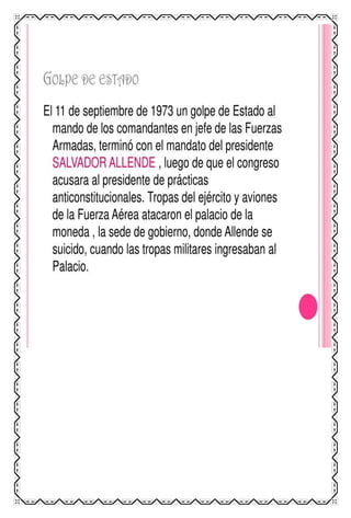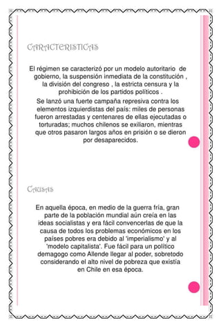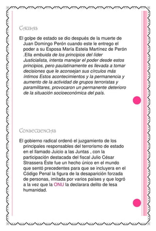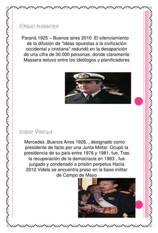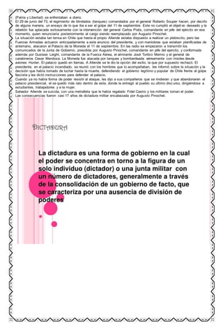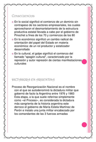 El documento proporciona información sobre las dictaduras militares en América Latina en el siglo XX. Explica que este tipo de régimen se caracterizaba por ser dirigido por juntas militares o un solo oficial militar que asumía el poder de forma autoritaria y suspendía las libertades civiles. Describe algunos de los dictadores militares más notorios en países como Argentina, Chile, Paraguay, Bolivia y otros, y explica cómo implementaron la censura, represión y terrorismo de estado contra la oposición a través de la tortura y desapar