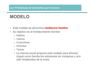 El documento describe 10 fortalezas de las familias resilientes: 1) visión positiva, 2) sentido de la vida, 3) ambiente cordial y sosegado, 4) flexibilidad, 5) comunicación, 6) gestión económica, 7) tiempo familiar, 8) tiempo libre compartido, 9) rutinas y celebraciones, 10) redes de apoyo. Estas fortalezas ayudan a las familias a enfrentar estresores sin romperse y salir fortalecidas de las crisis.
