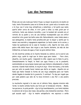 La historia trata de dos hermanas, donde la madre favorece a la mayor que es antipática al igual que ella, mientras que la menor es bondadosa. La menor debe ir a una fuente lejana por agua y allí un hada le da el don de que al hablar broten flores y piedras preciosas. Cuando la madre envía a la mayor, esta es maleducada con el hada y recibe el don de que al hablar salgan ranas y serpientes. La menor es rechazada por su madre y huye al bosque donde el hijo del rey se enamora de