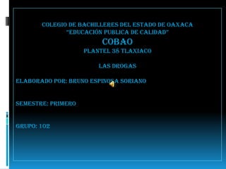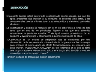Este documento trata sobre las drogas. Explica diferentes tipos de drogas como la cocaína, la marihuana, el LSD, la morfina y el alcohol e incluye sus efectos. También describe las causas de la drogadicción como problemas familiares e influencias sociales. Además, analiza las consecuencias del consumo de drogas como trastornos fisiológicos y deterioro de las relaciones personales. Por último, explica conceptos como la tolerancia cruzada entre drogas.