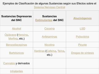 El documento resume los principales tipos de drogas, incluyendo sus efectos, riesgos y consecuencias. Define drogas como sustancias que afectan el sistema nervioso central y clasifica drogas en legales e ilegales, duras y blandas. Describe los efectos de drogas comunes como alcohol, anfetaminas, cocaína, éxtasis, GHB, heroína y marihuana, señalando que su consumo puede causar adicción, dependencia, daños físicos y enfermedades.