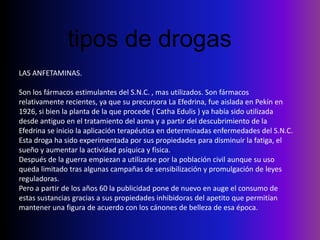 Este documento describe varios tipos de drogas, incluyendo anfetaminas, alucinógenos y otras sustancias psicoactivas. Explica brevemente los efectos y riesgos de cada droga, como las anfetaminas que aumentan la actividad pero pueden causar intoxicación, y los alucinógenos como el LSD, la mescalina y los hongos que distorsionan la percepción de la realidad. También menciona otras drogas como la datura, la nuez moscada y el STP.