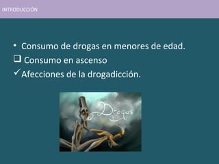 El documento trata sobre el consumo de drogas en adolescentes. Explica que el consumo de drogas entre adolescentes ha ido en aumento y es un problema grave. Analiza las causas del consumo de drogas en los jóvenes, los efectos negativos de la adicción a las drogas y las estadísticas del consumo en países de América Latina.