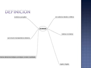 El documento clasifica las drogas en cuatro categorías: depresivos, estimulantes, alucinógenos y digitales. También advierte sobre las nuevas drogas digitales que usan frecuencias sonoras para alterar la conciencia y pueden causar problemas a largo plazo. Finalmente, promueve orientar a los hijos para prevenir el consumo de drogas.
