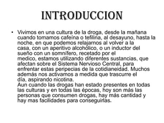 El documento habla sobre las drogas. Explica que vivimos en una cultura donde se consumen diferentes sustancias como cafeína, alcohol y medicamentos. Aunque el consumo de drogas ha existido siempre, hoy día hay más personas que las consumen y es más fácil conseguirlas. El consumo excesivo de drogas hace que la gente crea que no pasa nada al consumirlas y genera grandes costos para los estados en combatir la drogadicción. Luego define la drogadicción y explica los diferentes tipos de drogas según su grado de dependencia y efectos.
