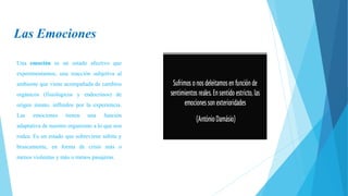 Las emociones son estados afectivos que experimentamos en respuesta al ambiente y que vienen acompañadas de cambios fisiológicos. Sirven como mecanismo de adaptación y tienen componentes cognitivos, conductuales e involuntarios fisiológicos. Existen seis emociones básicas: miedo, sorpresa, aversión, tristeza, alegría e ira, aunque cada persona las experimenta de manera única.