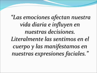 Este documento resume los tipos de emociones primarias y secundarias que experimentan los humanos, incluyendo la ira, alegría, tristeza, asco, angustia, miedo y sorpresa. También explica que las emociones afectan nuestra vida diaria e influyen en nuestras decisiones. Además, enfatiza la importancia de desarrollar inteligencia emocional para manejar emociones y tener mejores relaciones interpersonales.