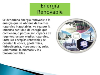 Este documento describe las diferencias entre energía renovable y no renovable. La energía renovable proviene de fuentes naturales como el viento, la geotermia, la hidroelectricidad, las mareas, el sol, las olas y la biomasa, que son inagotables o pueden regenerarse naturalmente. La energía no renovable proviene de combustibles fósiles como el petróleo y el carbón, y combustibles nucleares, que se encuentran en cantidades limitadas en la naturaleza y no pueden reemplazarse una vez que se agotan. También enumera