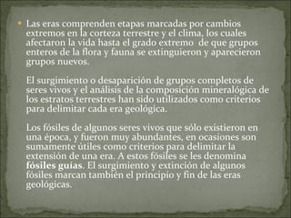 El documento describe cómo se mide el tiempo geológico de forma relativa y absoluta, y cómo se han utilizado los cambios en la corteza terrestre, el clima y la aparición y extinción de grupos de seres vivos para delimitar las diferentes eras geológicas de la Tierra. Explica que la Tierra comenzó a formarse hace 4700 millones de años y que la vida surgió por primera vez en los mares primitivos hace aproximadamente 3800-3900 millones de años durante la Era Precámbrica, cuando aparecieron las primeras