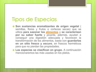 El documento habla sobre las especias más usadas en la cocina. Explica que las especias son sustancias aromáticas de origen vegetal que se usan para sazonar los alimentos. Luego clasifica las especias en grupos como salinos, ácidos y aromáticos, y menciona algunas de las más comunes dentro de cada grupo como la sal, el vinagre, el ajo y el romero. Finalmente, brinda detalles sobre el uso culinario de especias particulares como el orégano, la albahaca y el azafrán.