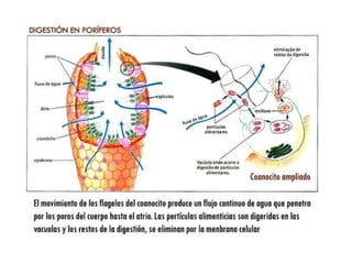 Las esponjas pertenecen al reino Animalia, subreino Parazoa y filo Porífera. Carecen de tejidos u órganos verdaderos y se alimentan a través de la filtración de partículas en el agua. Su cuerpo está formado por agregaciones de células diferenciadas con canales y cámaras perforadas por poros. La mayoría son marinas aunque algunas viven en agua dulce, se fijan a substratos y tienen reproducción asexual y sexual.