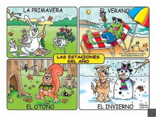 El documento enumera las cuatro estaciones del año: primavera, verano, otoño e invierno.