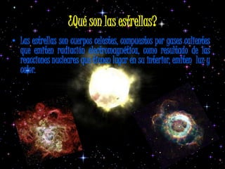 Las estrellas se forman en grandes nubes de gas y polvo interestelar como resultado del colapso gravitacional. Durante este proceso, la temperatura y presión aumentan hasta que se inicia la fusión nuclear, dando origen a una estrella. Las estrellas evolucionan y mueren expulsando material al espacio, el cual puede usarse para formar una nueva generación de estrellas y planetas.