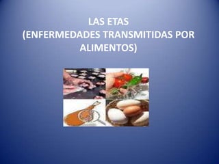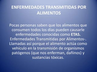 Este documento describe las enfermedades transmitidas por alimentos (ETAs), las cuales son causadas por la ingestión de alimentos contaminados con bacterias, virus, parásitos u otras sustancias dañinas. Las ETAs se dividen en infecciones e intoxicaciones alimentarias. Entre las bacterias más comunes que causan ETAs se encuentran Escherichia coli, Salmonella, Campylobacter, Listeria monocytogenes, Bacillus cereus, Clostridium botulinum, Clostridium perfringens y Staphylococcus aureus. Los factores como la disponibilidad de nutrient