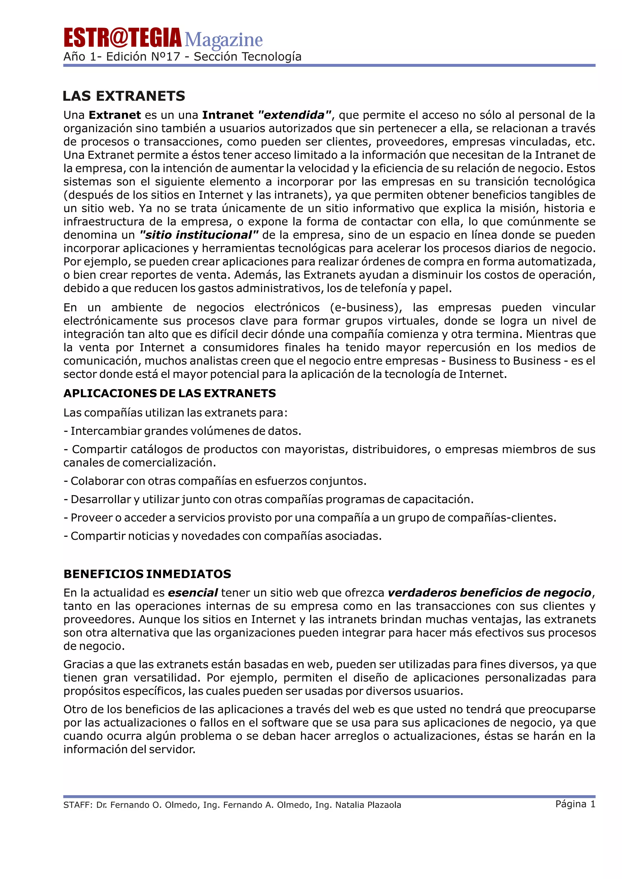 Una extranet permite el acceso limitado a la información de una intranet a usuarios externos autorizados como clientes y proveedores para aumentar la eficiencia en las relaciones comerciales. Las extranets permiten compartir información de catálogos, realizar pedidos de forma automatizada, y reducir costos administrativos. Al vincular procesos clave entre empresas, las extranets facilitan una colaboración estrecha donde es difícil distinguir donde termina una compañía y comienza otra.