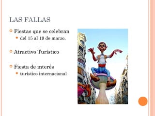 Las Fallas de Valencia son unas fiestas que se celebran anualmente del 15 al 19 de marzo en Valencia, España. Comenzaron en el siglo XVIII como monumentos satíricos pero ahora son una importante atracción turística internacional. Los días principales incluyen La Ofrenda a La Virgen de Los Desamparados del 17 al 18 de marzo y La Nit del Foc el 19 de marzo, que culmina con La Cabalgata del Fuego y La Nit de La Cremá, cuando se queman los monumentos falleros.