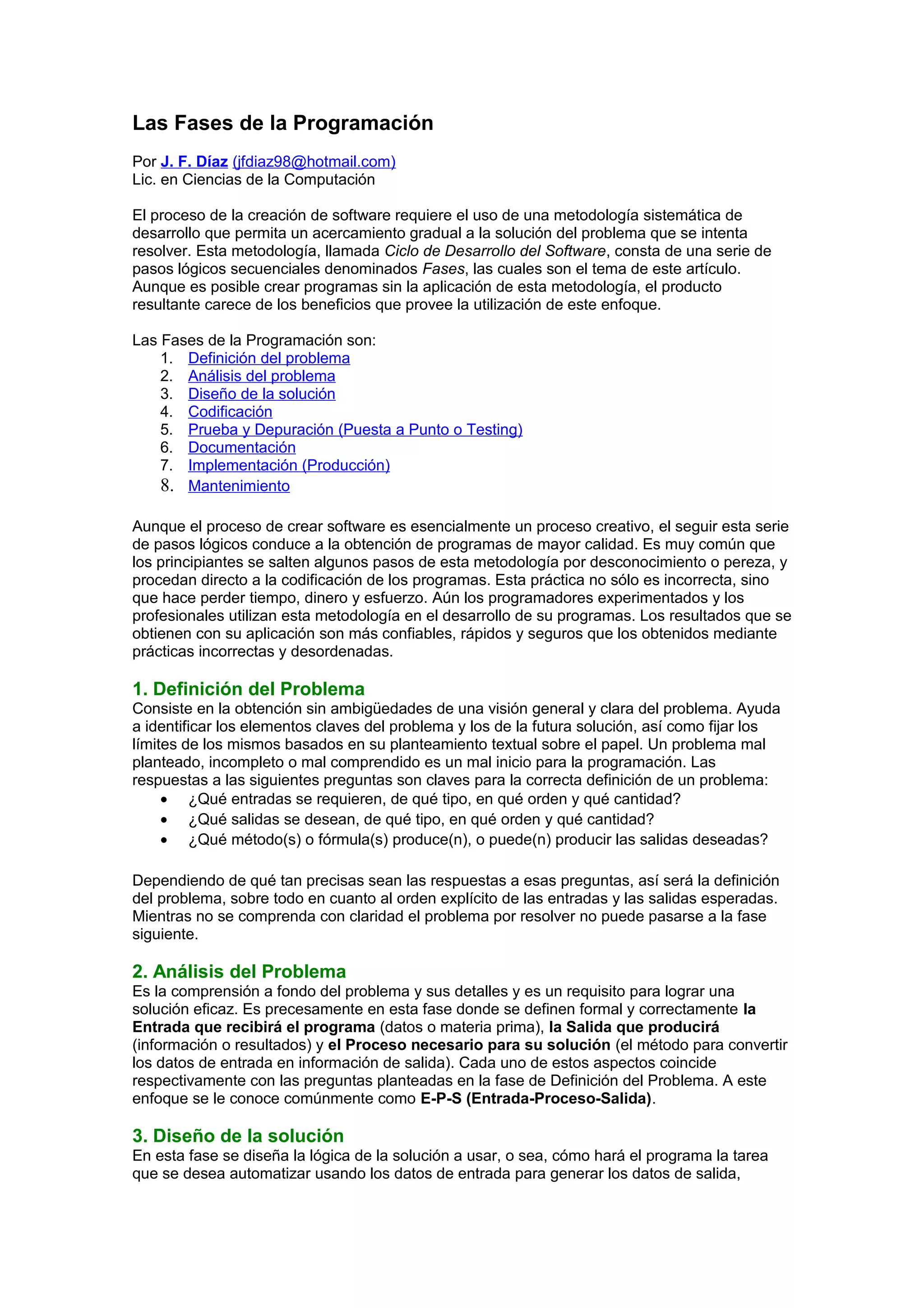 El documento describe las 8 fases del ciclo de desarrollo de software, incluyendo la definición del problema, análisis, diseño, codificación, pruebas, documentación, implementación y mantenimiento. Explica que seguir este proceso sistemático conduce a programas de mayor calidad. Cada fase es importante y las posteriores dependen de las anteriores.