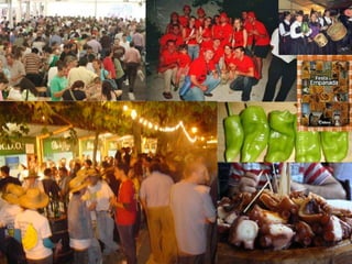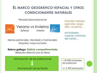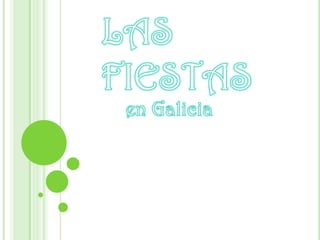 Este documento describe las diferentes fiestas tradicionales que se celebran en Galicia a lo largo del año. Se divide en fiestas relacionadas con las estaciones como Carnaval, Semana Santa, San Juan; romerías a santuarios importantes como Nosa Señora da Barca en Muxía; fiestas patronales en honor a los santos de cada parroquia; y festivales gastronómicos que promueven productos típicos como el queso de Arzúa, el vino albariño o el pulpo de Carballiño. Much