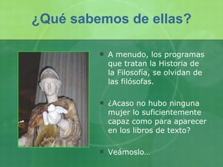 Este documento presenta un resumen de las vidas y obras de importantes filósofas a lo largo de la historia, comenzando con Hipatia de Alejandría en el siglo V y finalizando con Simone de Beauvoir en el siglo XX. Algunas de las filósofas destacadas son Santa Teresa de Jesús, Sor Juana Inés de la Cruz, Mary Wollstonecraft y Simone de Beauvoir. El documento describe sus contribuciones al pensamiento filosófico y los desafíos que enfrentaron como mujeres en sus respectivas épocas.