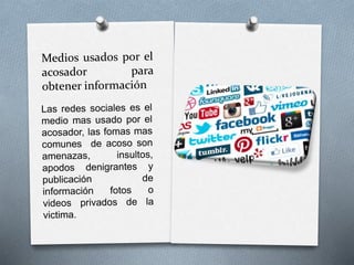 Este documento define el ciberacoso y describe sus características, ámbitos, procedimientos y efectos. El ciberacoso implica acosar a individuos u grupos a través de dispositivos electrónicos con el fin de causar angustia emocional. Puede ocurrir en contextos escolares, laborales o familiares. Los acosadores obtienen información sobre las víctimas para manipularlas y causar daños como depresión, estrés e incluso suicidio.