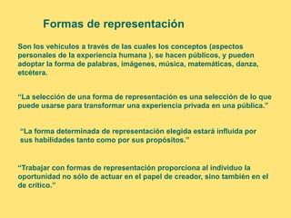 El documento describe las diferentes formas de representación como palabras, imágenes y música, y tres modos de tratar estas formas: mimético, expresivo y convencional. También discute la importancia de exponer a los estudiantes a múltiples formas de representación para fomentar su desarrollo cognitivo y creatividad.