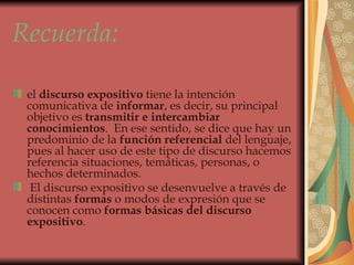 El documento describe las formas discursivas básicas del discurso expositivo, que son la definición, la descripción, la caracterización, la narración y el discurso de comentario. Explica cada una de estas formas y proporciona ejemplos para ilustrarlas.