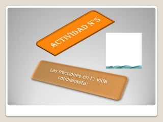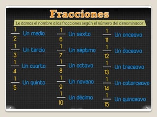 El documento explica que una fracción representa matemáticamente la división de una unidad en partes iguales. Una fracción se escribe con un número (el numerador) sobre otro (el denominador), donde el denominador indica el número total de partes en que se divide la unidad y el numerador indica cuántas de esas partes se toman. El documento proporciona ejemplos de cómo representar fracciones usando dibujos divididos en partes.