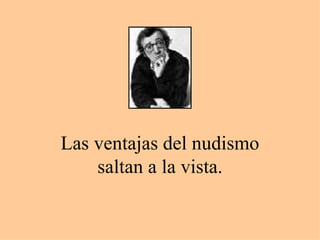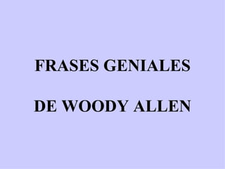 Este documento contiene una serie de frases ingeniosas y agudas de Woody Allen sobre temas como el matrimonio, el sexo, la medicina, la amistad y la política. Algunas de las frases bromean sobre la fidelidad conyugal, los problemas de los diabéticos, la dificultad de mantener una amistad y la capacidad de los políticos para ignorar problemas mayores.