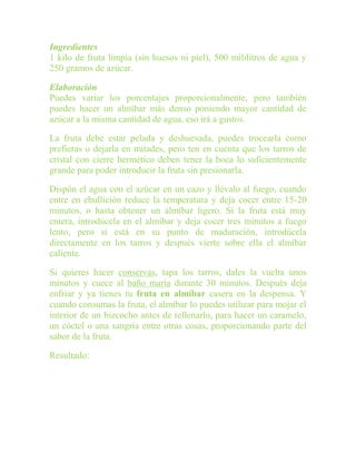 Las frutas son frutos comestibles obtenidos de plantas que son dulces y ácidos, con aroma e importantes nutrientes. Proveen vitaminas, minerales y fibra, y comer por lo menos cinco porciones al día puede reducir el riesgo de cáncer. Se pueden preparar en almibar u otras recetas caseras.
