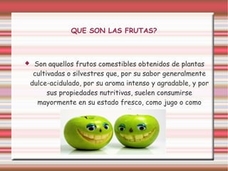 El documento describe las frutas y sus beneficios. Define las frutas como frutos comestibles obtenidos de plantas que se consumen principalmente frescos por su sabor dulce-ácido y propiedades nutritivas. Clasifica las frutas en cítricas, tropicales, del bosque y secas. Explica que todas las frutas tienen beneficios, como que las manzanas protegen contra los radicales libres y tienen propiedades anticancerígenas, y las fresas y naranjas contienen vitaminas A, C y E. Finalmente, recomi