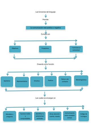 El documento describe las funciones del lenguaje, incluyendo la comunicación, cumplir objetivos y propósitos, y crear diferentes funciones como apelativa, emotiva, poética, representativa, fática o de contacto y metalingüística. Estas funciones se encargan de comunicar sucesos reales, identificar actitudes, exteriorizar sentimientos, atraer atención en cuentos y novelas, y permitir la comunicación entre emisor y receptor.