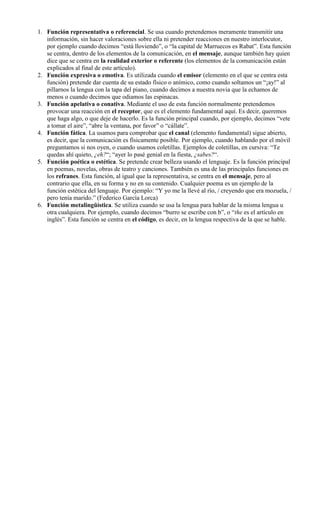 El documento describe las seis principales funciones del lenguaje según Roman Jakobson: 1) función representativa o referencial, que se usa para transmitir información de forma objetiva; 2) función expresiva o emotiva, que permite al emisor expresar sus sentimientos y estados de ánimo; 3) función apelativa o conativa, que busca provocar una reacción en el receptor; 4) función fática, que se usa para mantener el contacto entre emisor y receptor; 5) función poética, orientada a crear belleza mediante el lenguaje; y
