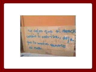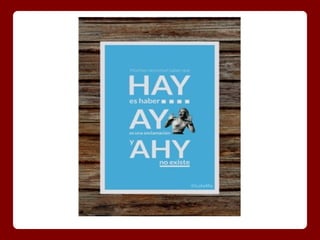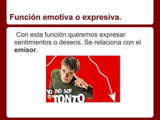 El documento describe las diferentes funciones del lenguaje: la función emotiva o expresiva para expresar sentimientos, la función conativa o apelativa para incidir en el comportamiento del receptor, la función poética o estética que se centra en el mensaje y cómo se transmite, la función referencial relacionada con el contexto para hablar de la realidad, la función metalingüística relacionada con el código para hablar de la lengua, y la función fática o de contacto para iniciar, mantener o terminar la comunicación. El documento luego incluye imágenes y pide ident