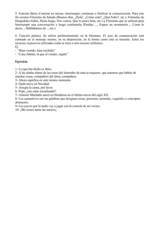 El documento describe las seis funciones del lenguaje: expresiva, apelativa, referencial, metalingüística, fática y poética. La función expresiva se refiere a la expresión de emociones del emisor. La función apelativa se centra en el receptor. La función referencial trata sobre hechos objetivos. La función metalingüística se enfoca en el código lingüístico. La función fática inicia, interrumpe o finaliza la comunicación. La función poética se usa principalmente en literatura.