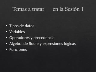 El documento describe los fundamentos de la programación en Python, incluyendo tipos de datos como números, cadenas, listas, y booleanos, así como la forma de definir variables y asignarles valores. Se aborda también la operación de operadores aritméticos y su precedencia, así como el uso de lógica booleana para la toma de decisiones en algoritmos. Además, se discuten las normas para nombrar variables y las características de las funciones que manipulan datos.