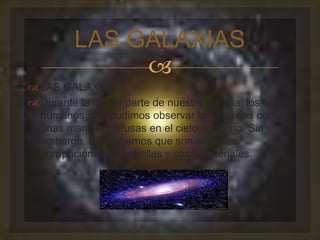 El documento describe las galaxias y los componentes del Sistema Solar. Explica que las galaxias son grandes agrupaciones de estrellas, gas y polvo, y que nuestro Sistema Solar forma parte de la Vía Láctea. También describe brevemente los planetas del Sistema Solar y algunas características de las estrellas y galaxias.