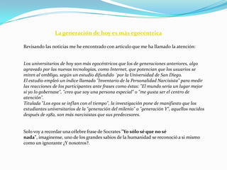 El documento analiza cómo las nuevas generaciones son más egocéntricas que las anteriores debido a la influencia de Internet y las redes sociales. Un estudio encontró que los estudiantes universitarios de la Generación Y, nacidos después de 1982, son más narcisistas que generaciones previas cuando se les aplicó una prueba de personalidad narcisista. El documento también discute cómo hoy en día pocas familias cocinan en casa a diferencia de generaciones pasadas y presenta a Narda Lepes, una cocinera que busca explorar la alimentación de