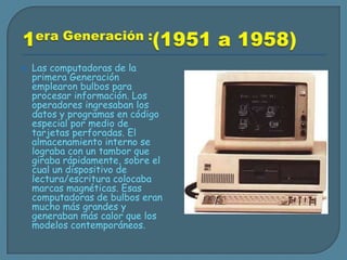 El documento resume las cinco primeras generaciones de computadoras desde 1951 hasta 1989, describiendo las tecnologías clave de cada generación como los bulbos, transistores, circuitos integrados de silicio y microprocesadores que permitieron computadoras más pequeñas, rápidas y eficientes energéticamente a lo largo del tiempo. La quinta generación se caracterizó por avances tecnológicos rápidos que dificultaron definir claramente cada generación.