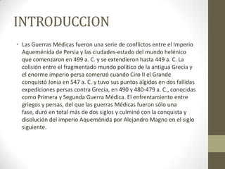 Las Guerras Médicas fueron una serie de conflictos entre el Imperio Persa y las ciudades-estados de Grecia entre 499 a.C. y 449 a.C. que comenzaron cuando Persia conquistó Jonia en 547 a.C. e incluyeron dos invasiones persas de Grecia, la Primera Guerra Médica en 490 a.C. y la Segunda Guerra Médica en 480-479 a.C. Las batallas clave fueron la victoria griega en la batalla de Maratón en 490 a.C. y las victorias griegas en las