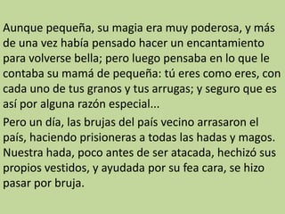 Un hada fea pero muy lista y amable usó su inteligencia y magia para engañar a las brujas y salvar a su país. A pesar de ser criticada por su apariencia, el hada logró encerrar a las brujas malvadas y hacer que la gente valorara más las cualidades internas que la belleza física.