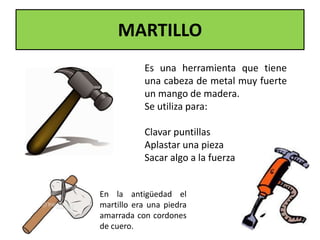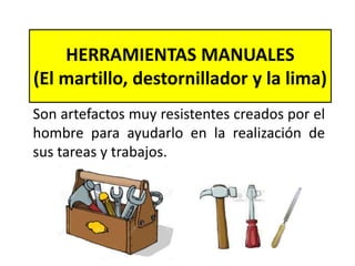 El documento describe tres herramientas manuales comunes: el martillo, el destornillador y la lima. El martillo se usa para clavar clavos y sacar objetos, tiene una cabeza de metal y un mango de madera. El destornillador se usa para apretar y aflojar tornillos. La lima se usa para desgastar y suavizar piezas de metal, plástico o madera. Estas tres herramientas son importantes para la reparación y fabricación de objetos.