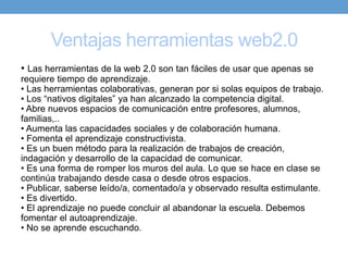 Este documento describe las herramientas web 2.0, que permiten a los usuarios interactuar y colaborar generando contenido. Algunos ejemplos son comunidades web, redes sociales, wikis y blogs. Las ventajas incluyen facilidad de uso, colaboración, aprendizaje social y romper las barreras del aula. Las desventajas pueden ser aislamiento, necesidad de recursos técnicos y falta de control o calidad en los contenidos.