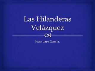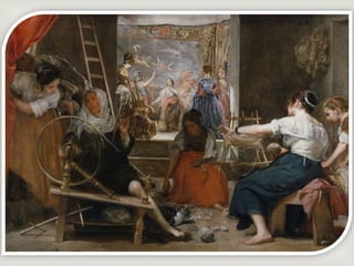 Este documento resume la obra pictórica "La fábula de Aracne (Las hilanderas)" de Diego Velázquez, pintada en 1657. Incluye información sobre las dimensiones de la obra, su título, el artista, época y lugar donde se encuentra actualmente. También proporciona detalles biográficos sobre Velázquez y describe brevemente otro cuadro llamado "El rapto de Europa" que aparece representado en el fondo de "Las hilanderas".